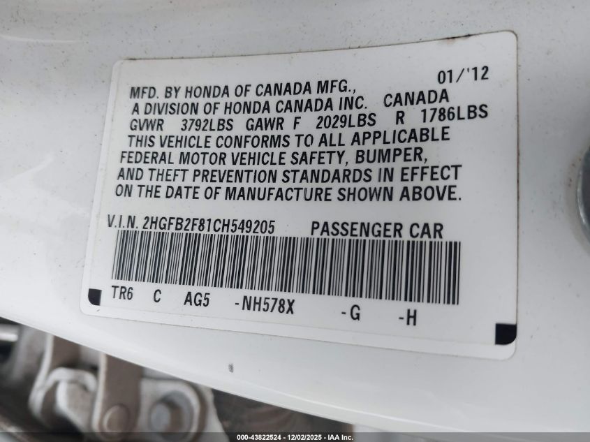 2012 HONDA CIVIC 2012 року Бензин, 1.8, Передній привід, vin - 2HGFB2F81CH549205 з США