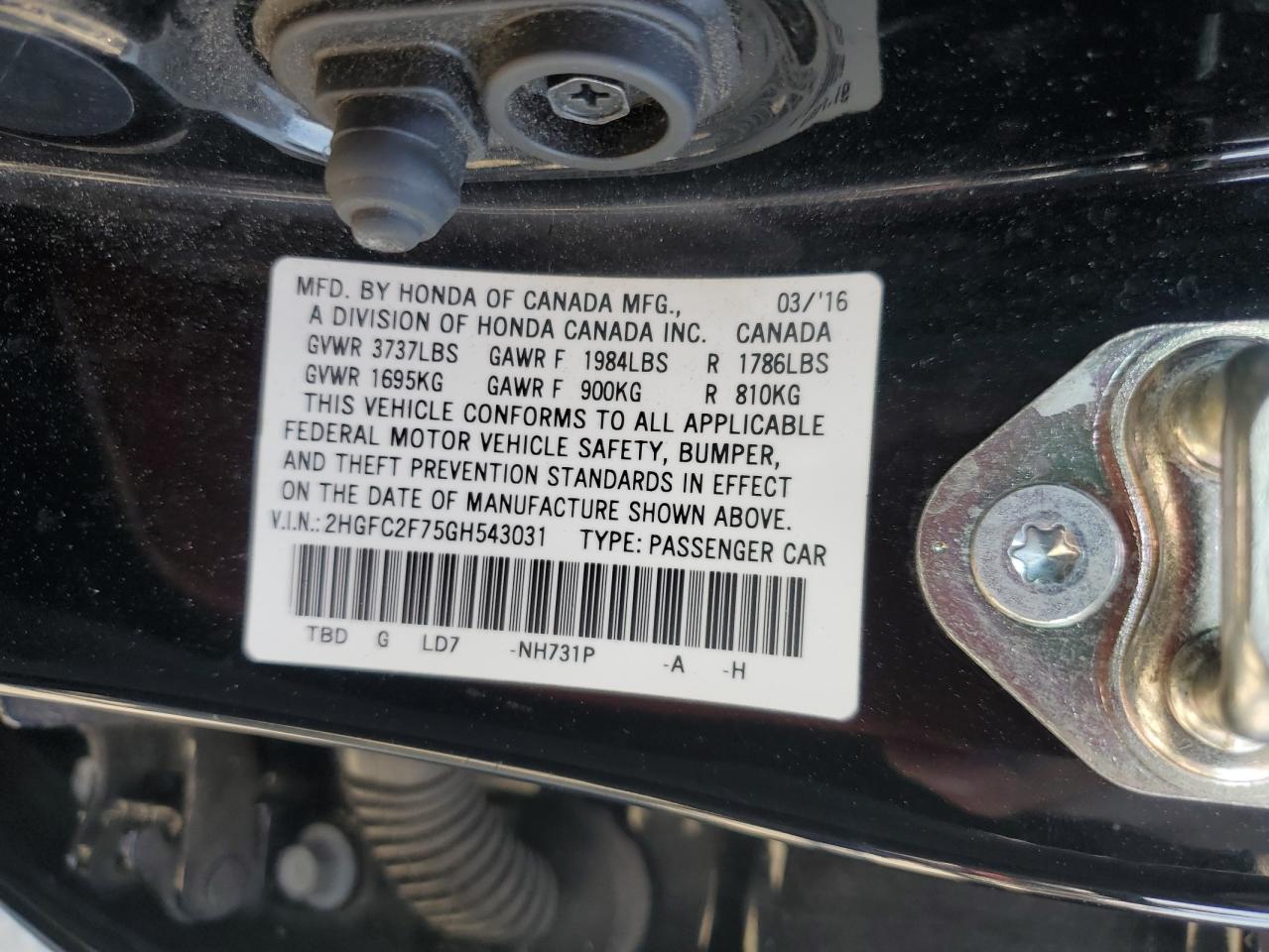 2016 HONDA CIVIC 2016 року Бензин, 2.0, , vin - 2HGFC2F75GH543031 з США