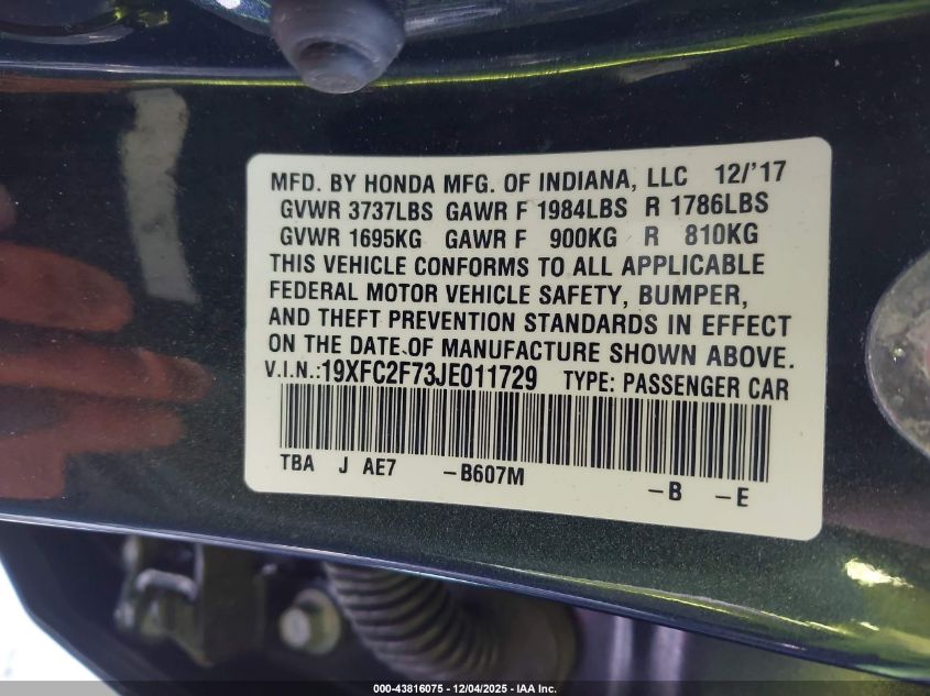 2018 HONDA CIVIC 2018 року Бензин, 2.0, Передній привід, vin - 19XFC2F73JE011729 з США
