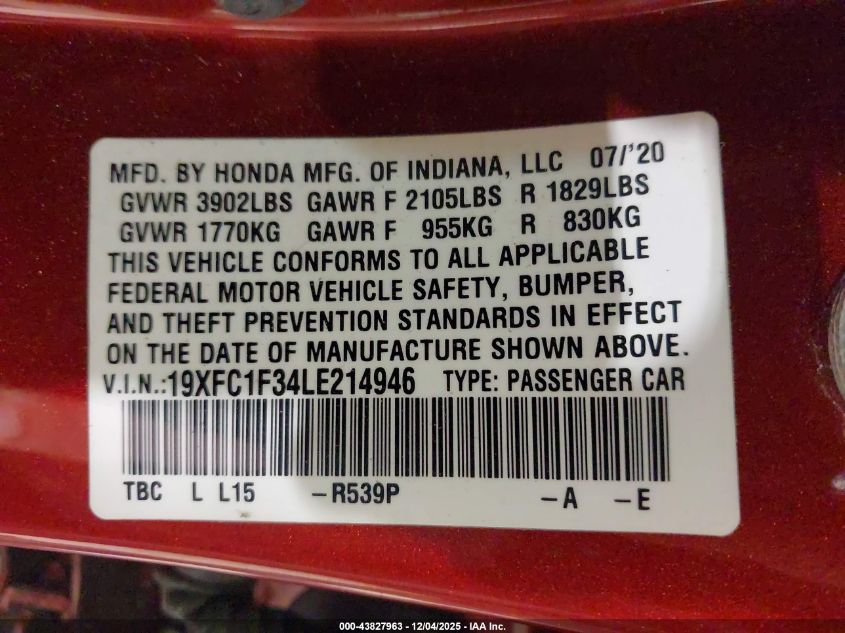 2020 HONDA CIVIC 2020 року Бензин, 1.5, Передній привід, vin - 19XFC1F34LE214946 з США