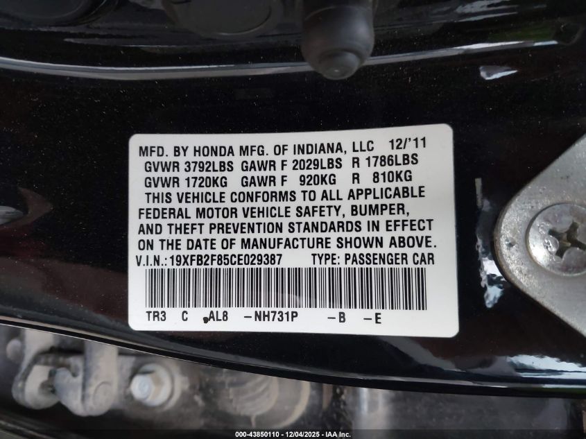 2012 HONDA CIVIC 2012 року Бензин, 1.8, Передній привід, vin - 19XFB2F85CE029387 з США