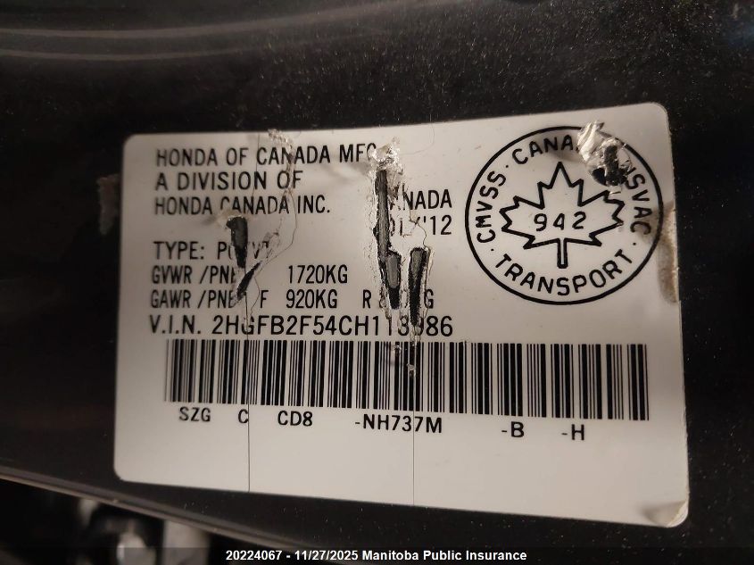 2012 HONDA CIVIC 2012 року Бензин, , Передній привід, vin - 2HGFB2F54CH113986 з США