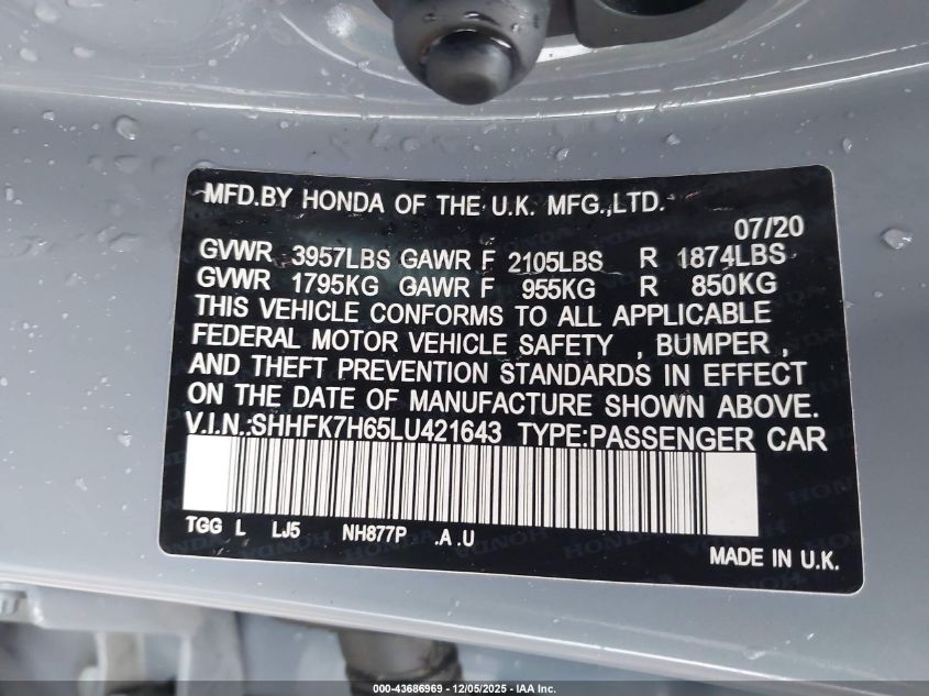 2020 HONDA CIVIC 2020 року Бензин, 1.5, Передній привід, vin - SHHFK7H65LU421643 з США