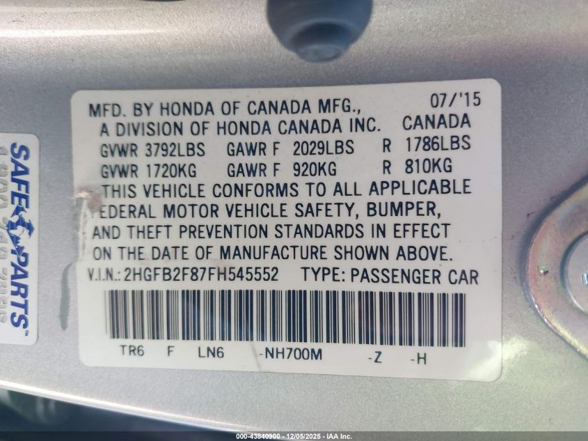 2015 HONDA CIVIC 2015 року Бензин, 1.8, Передній привід, vin - 2HGFB2F87FH545552 з США