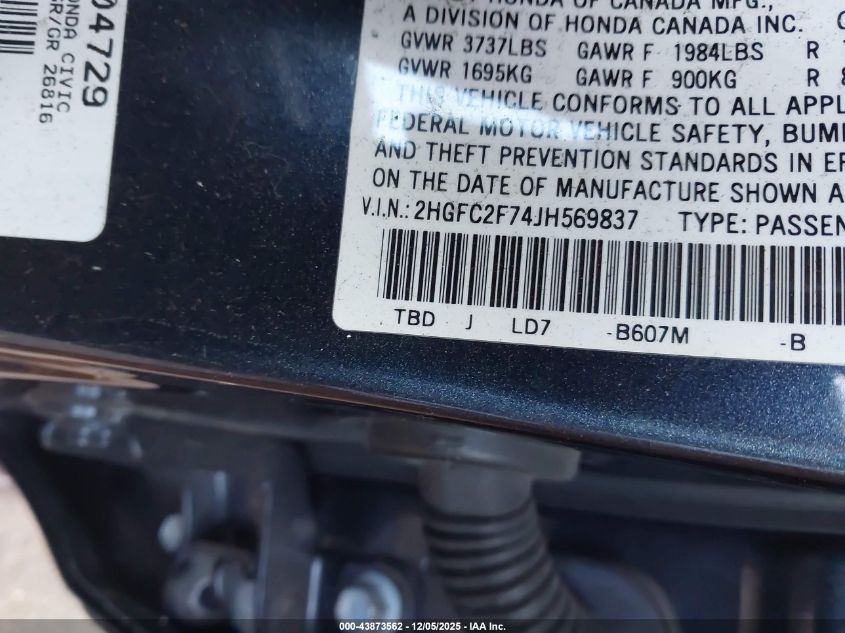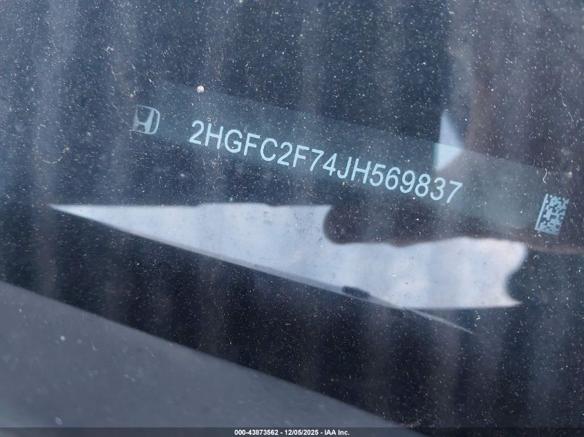 2018 HONDA CIVIC 2018 року Бензин, 2.0, Передній привід, vin - 2HGFC2F74JH569837 з США