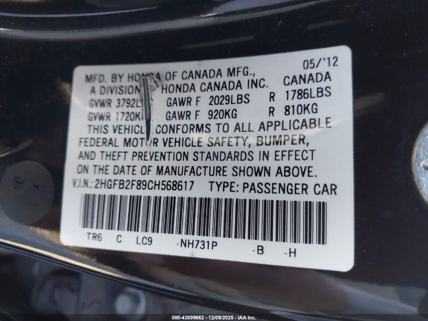 2012 HONDA CIVIC 2012 року Бензин, 1.8, Передній привід, vin - 2HGFB2F89CH568617 з США