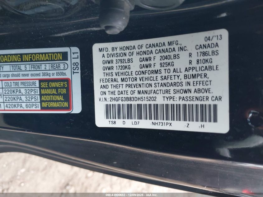 2013 HONDA CIVIC 2013 року Бензин, 1.8, Передній привід, vin - 2HGFG3B83DH515202 з США