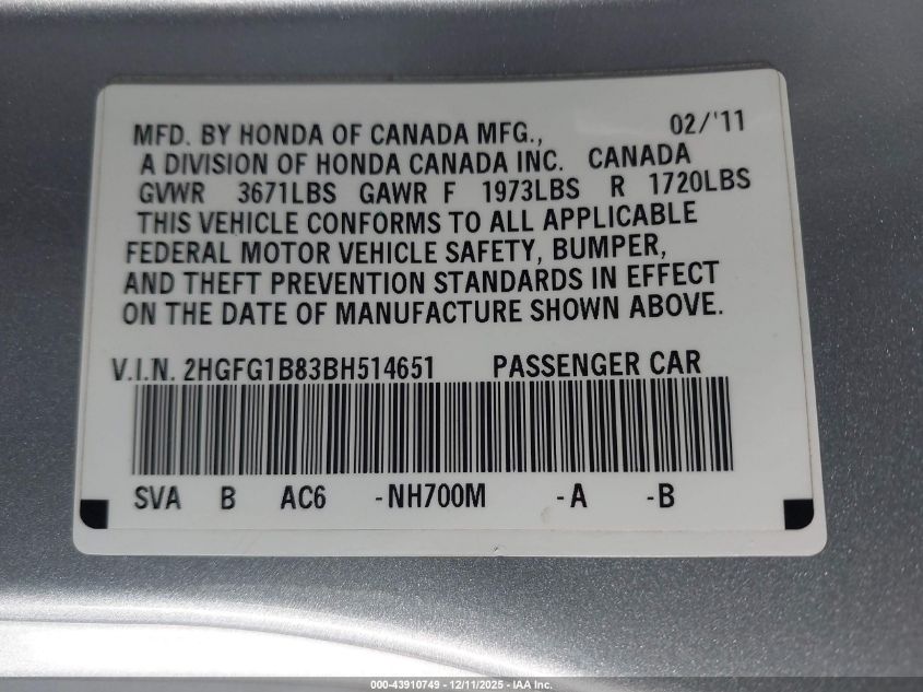 2011 HONDA CIVIC 2011 року Бензин, 1.8, Передній привід, vin - 2HGFG1B83BH514651 з США