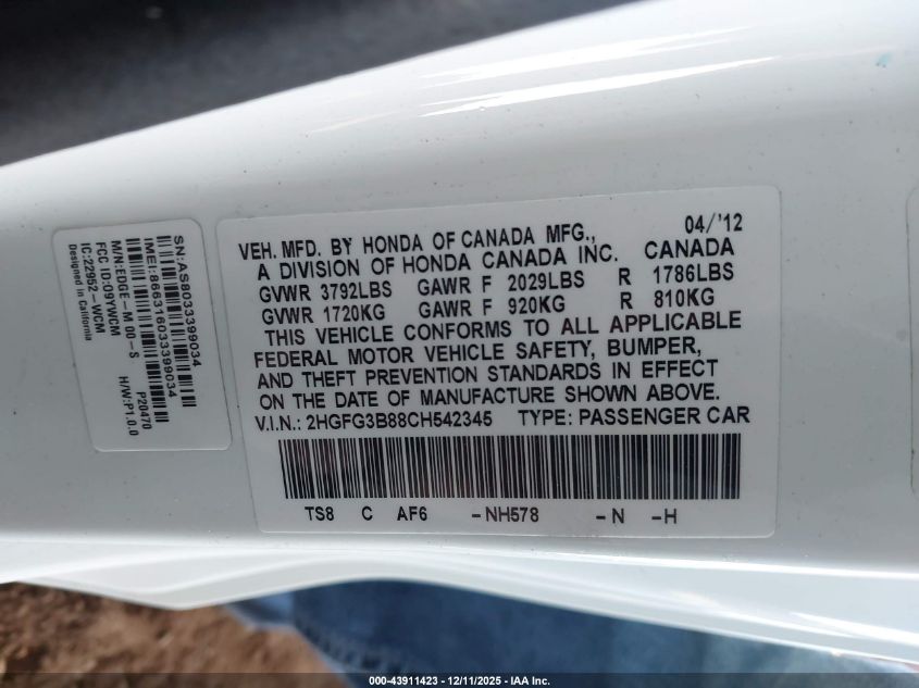 2012 HONDA CIVIC 2012 року Бензин, 1.8, Передній привід, vin - 2HGFG3B88CH542345 з США