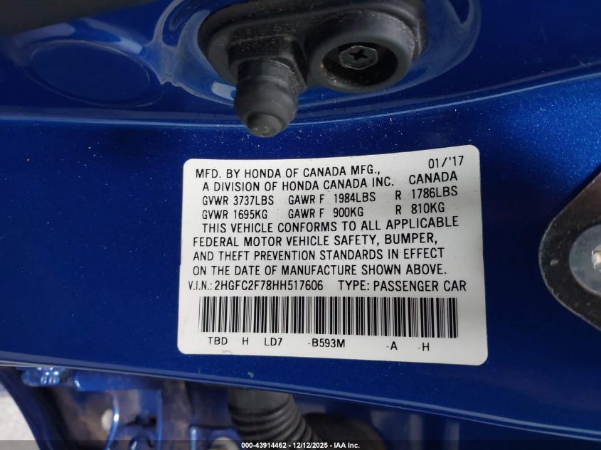 2017 HONDA CIVIC 2017 року Бензин, 2.0, Передній привід, vin - 2HGFC2F78HH517606 з США