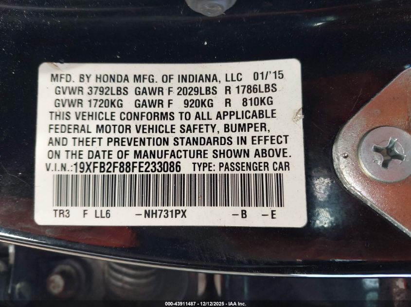 2015 HONDA CIVIC 2015 року Бензин, 1.8, Передній привід, vin - 19XFB2F88FE233086 з США