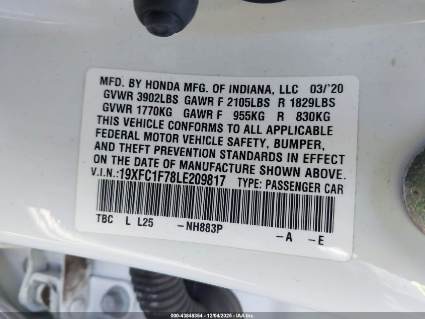 2020 HONDA CIVIC 2020 року Бензин, 1.5, Передній привід, vin - 19XFC1F78LE209817 з США