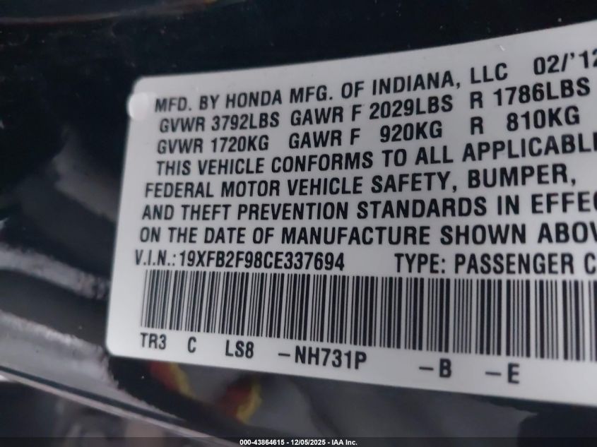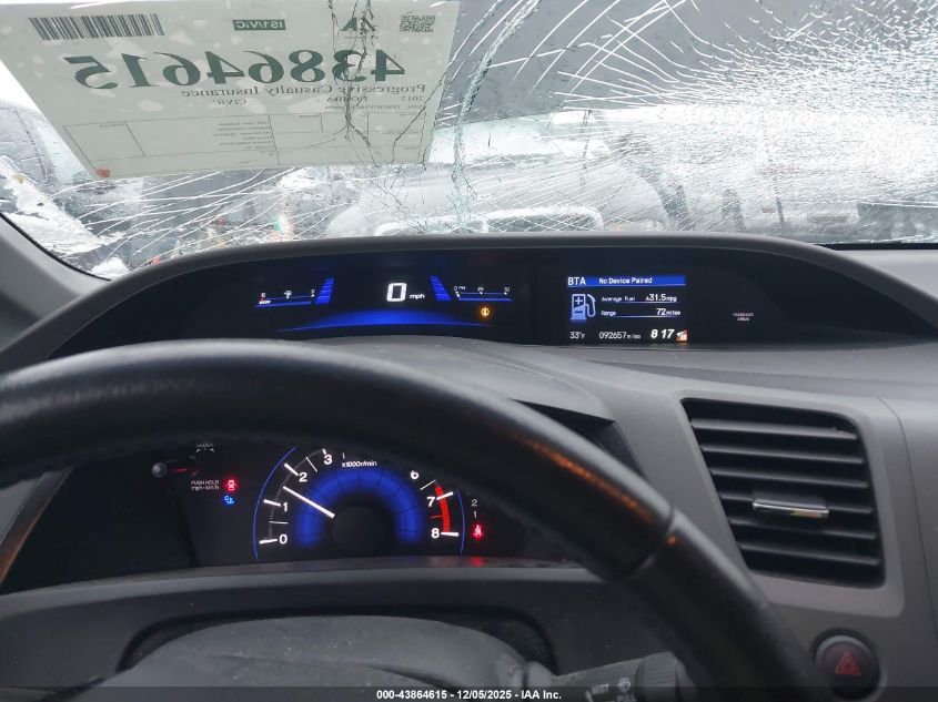 2012 HONDA CIVIC 2012 року Бензин, 1.8, Передній привід, vin - 19XFB2F98CE337694 з США