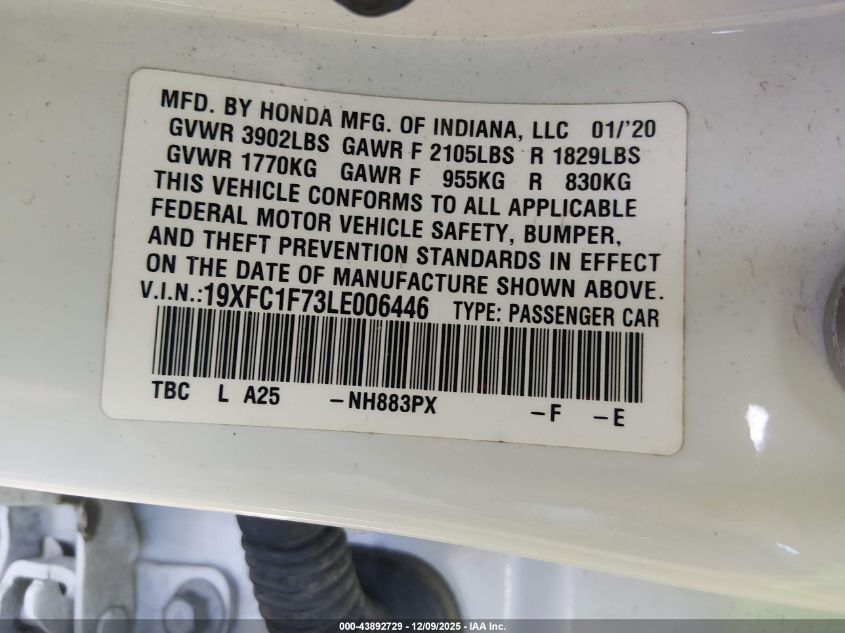 2020 HONDA CIVIC 2020 року Бензин, 1.5, Передній привід, vin - 19XFC1F73LE006446 з США