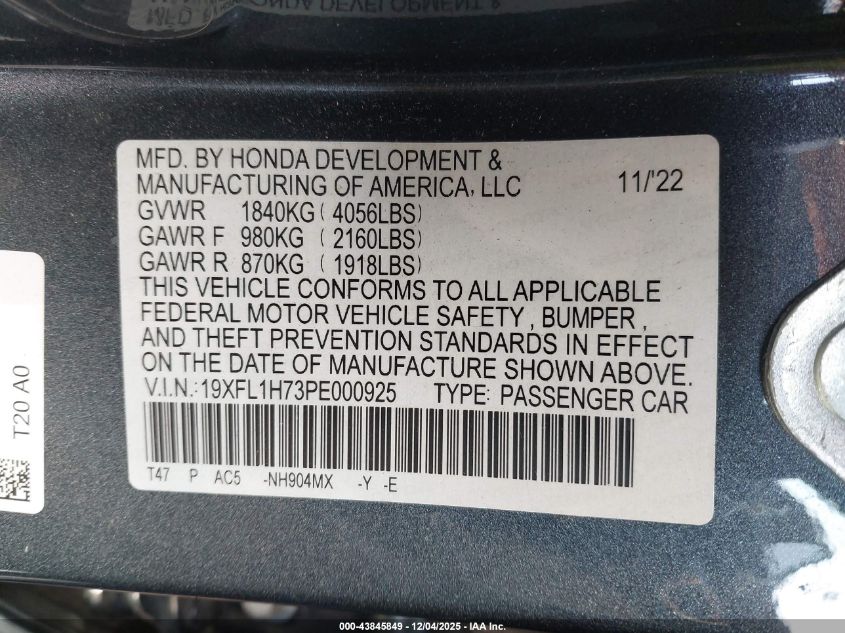 2023 HONDA CIVIC 2023 року Бензин, 1.5, Передній привід, vin - 19XFL1H73PE000925 з США
