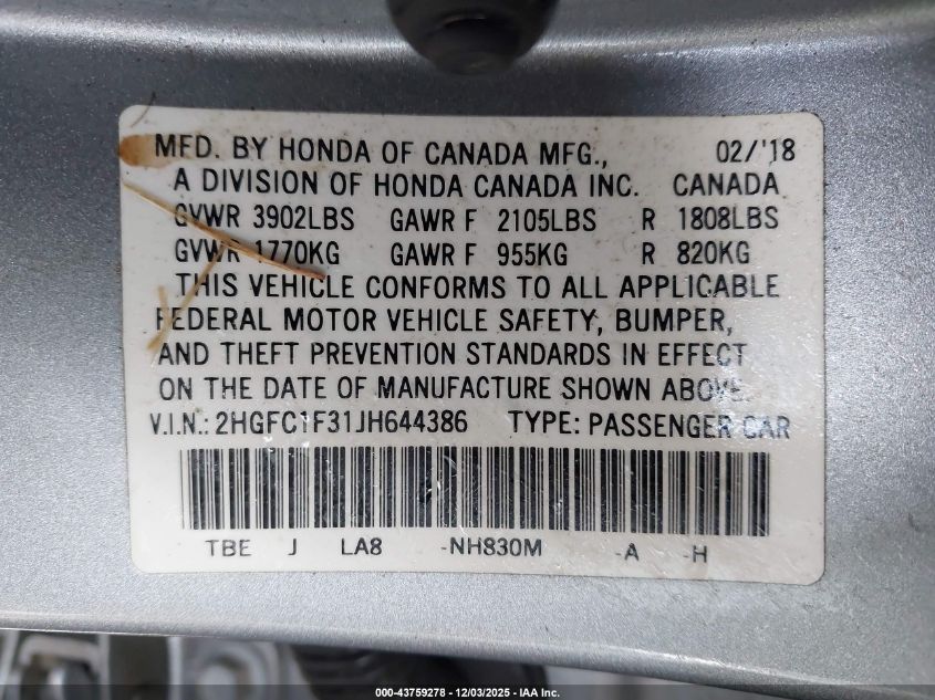 2018 HONDA CIVIC 2018 року Бензин, 1.5, Передній привід, vin - 2HGFC1F31JH644386 з США