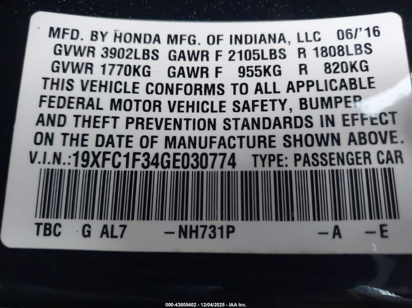 2016 HONDA CIVIC 2016 року Бензин, 1.5, Передній привід, vin - 19XFC1F34GE030774 з США