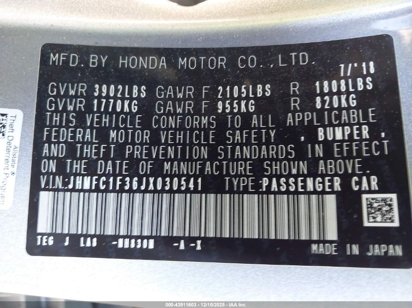 2018 HONDA CIVIC 2018 року Бензин, 1.5, Передній привід, vin - JHMFC1F36JX030541 з США