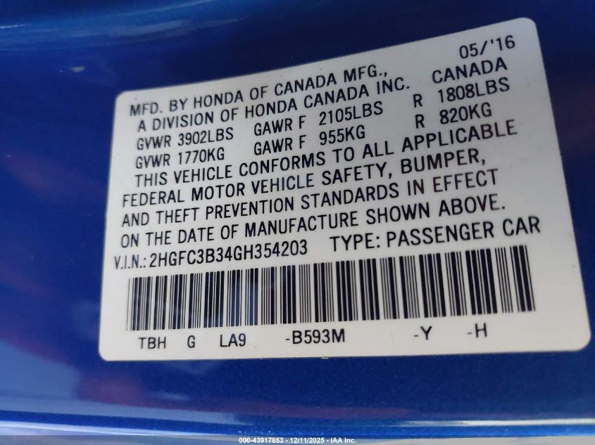 2016 HONDA CIVIC 2016 року Бензин, 1.5, Передній привід, vin - 2HGFC3B34GH354203 з США