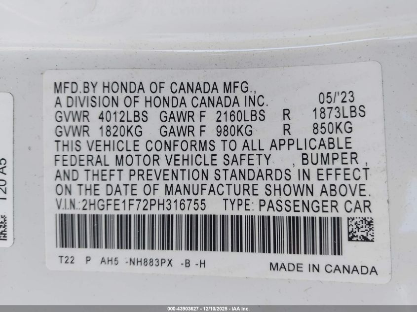 2023 HONDA CIVIC 2023 року Бензин, 1.5, Передній привід, vin - 2HGFE1F72PH316755 з США