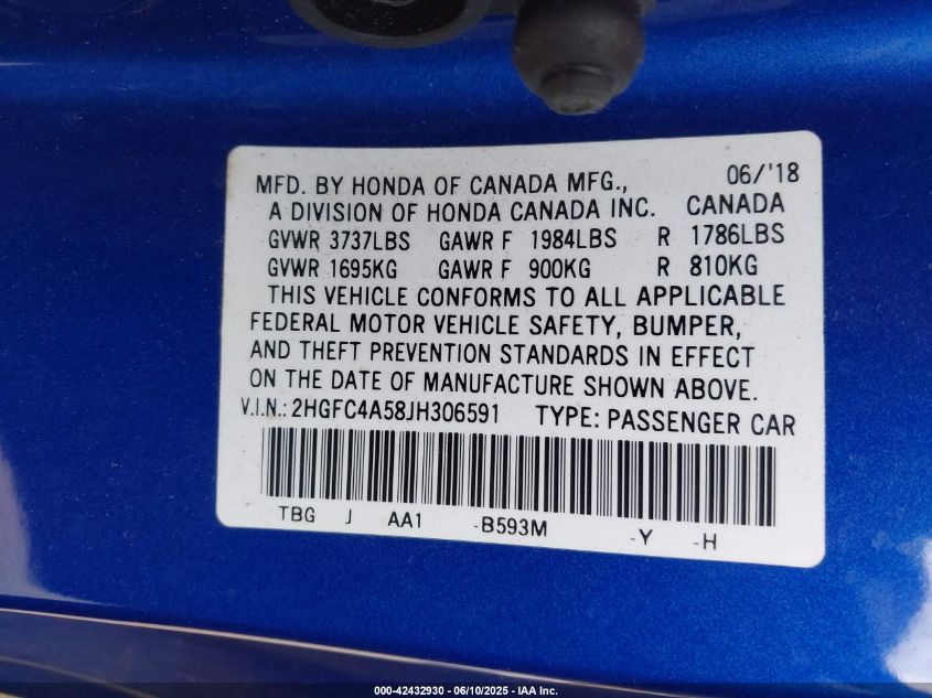 2018 HONDA CIVIC 2018 року Бензин, 2.0, Передній привід, vin - 2HGFC4A58JH306591 з США