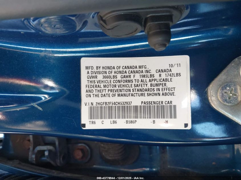 2012 HONDA CIVIC 2012 року Бензин, 1.8, Передній привід, vin - 2HGFB2F54CH532937 з США