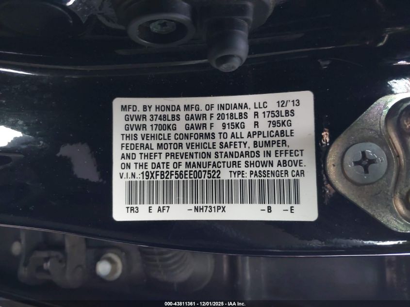 Колір ЧорнийЦиліндри 4Привід Передній привідVIN 19XFB2F56EE007522Стан Заводиться та їде (перевірено)Ушкодження Передня або задня AutoRIA