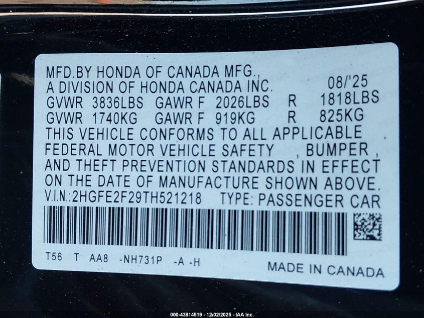 2026 HONDA CIVIC 2026 року Бензин, 2.0, Передній привід, vin - 2HGFE2F29TH521218 з США