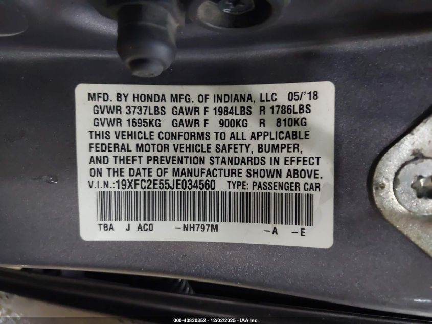 2018 HONDA CIVIC 2018 року Бензин, 2.0, Передній привід, vin - 19XFC2E55JE034560 з США