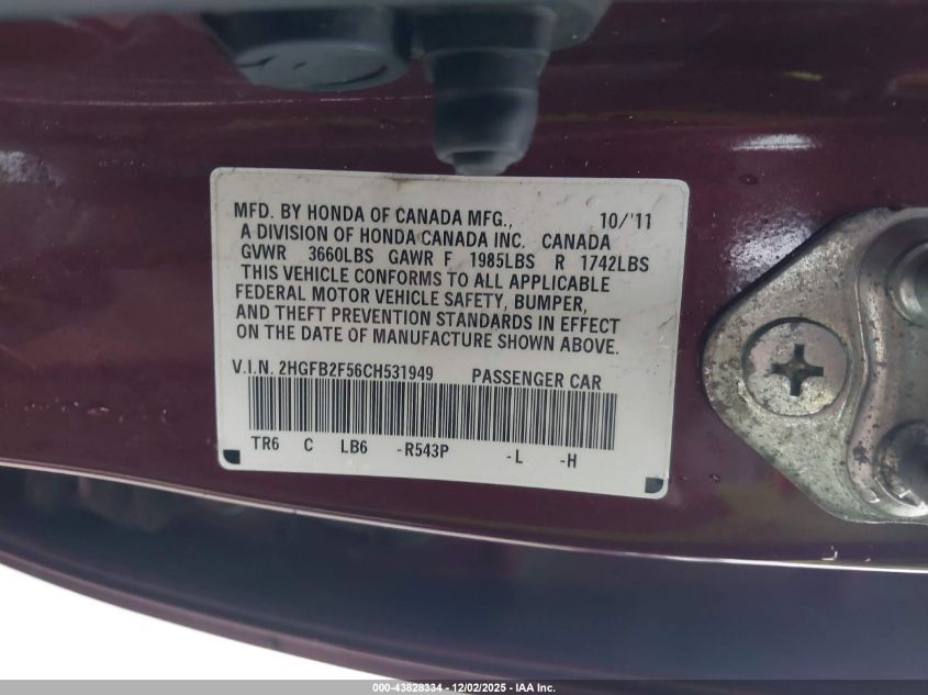 2012 HONDA CIVIC 2012 року Бензин, 1.8, Передній привід, vin - 2HGFB2F56CH531949 з США