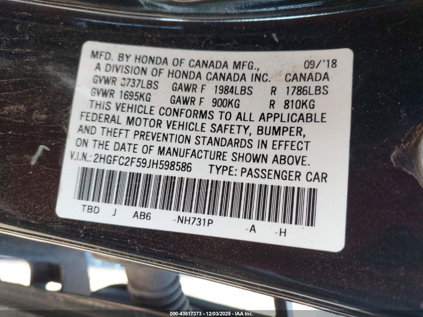 2018 HONDA CIVIC 2018 року Бензин, 2.0, Передній привід, vin - 2HGFC2F59JH598586 з США
