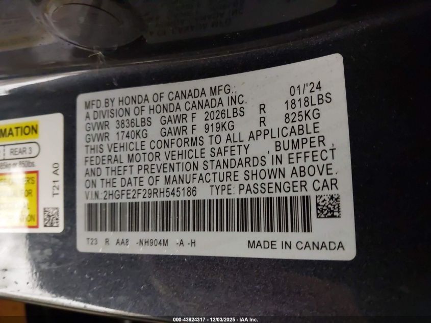 2024 HONDA CIVIC 2024 року Бензин, 2.0, Передній привід, vin - 2HGFE2F29RH545186 з США