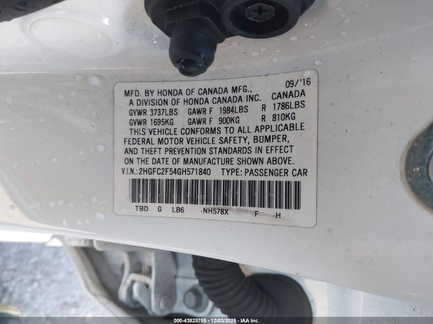 2016 HONDA CIVIC 2016 року Бензин, 2.0, Передній привід, vin - 2HGFC2F54GH571840 з США