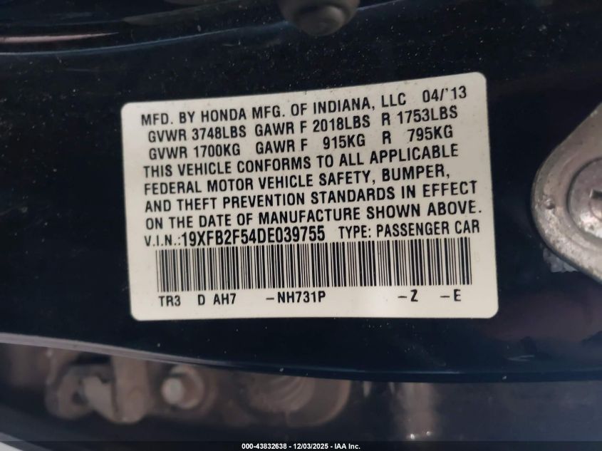 2013 HONDA CIVIC 2013 року Бензин, 1.8, Передній привід, vin - 19XFB2F54DE039755 з США