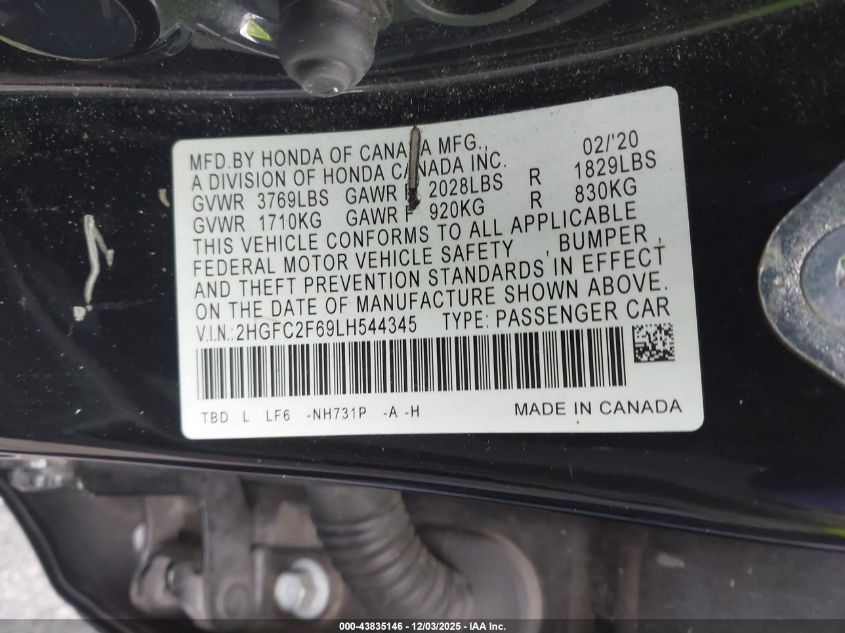 2020 HONDA CIVIC 2020 року Бензин, 2.0, Передній привід, vin - 2HGFC2F69LH544345 з США