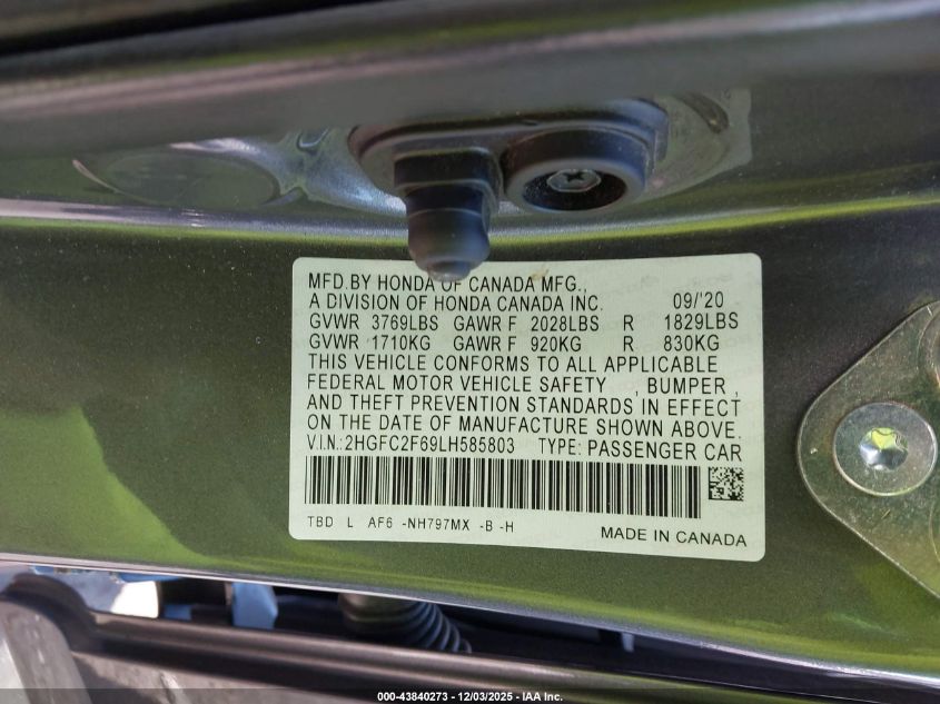 2020 HONDA CIVIC 2020 року Бензин, 2.0, Передній привід, vin - 2HGFC2F69LH585803 з США