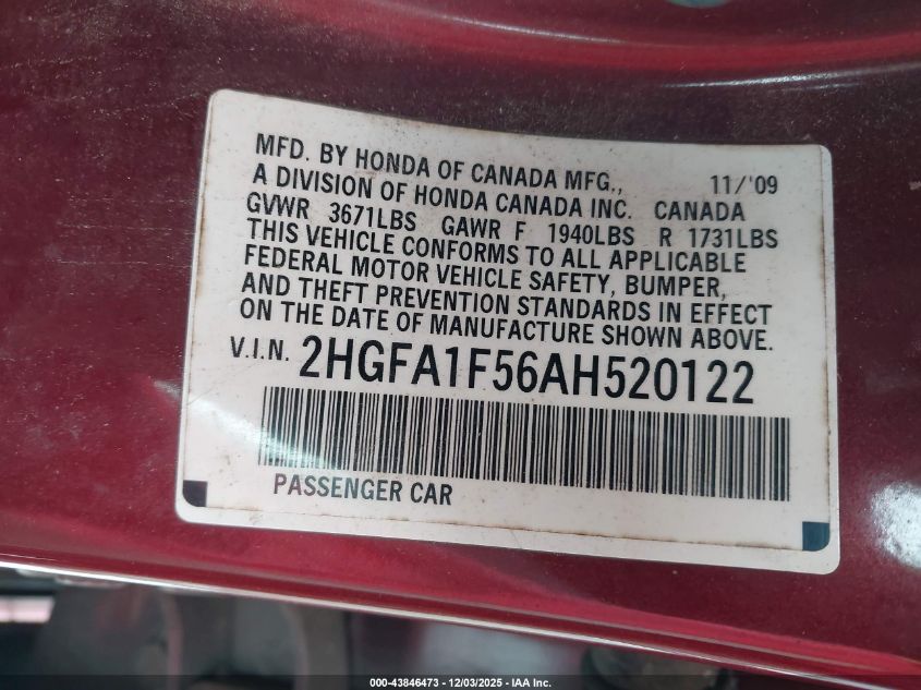 2010 HONDA CIVIC 2010 року Бензин, 1.8, Передній привід, vin - 2HGFA1F56AH520122 з США