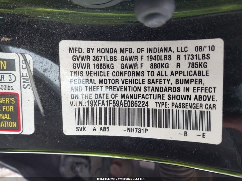 2010 HONDA CIVIC 2010 року Бензин, 1.8, Передній привід, vin - 19XFA1F59AE086224 з США