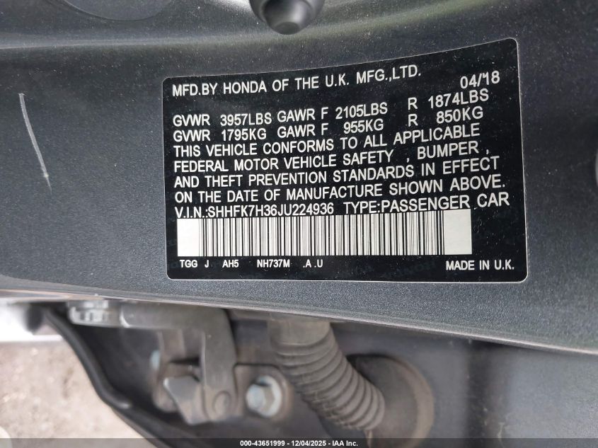 2018 HONDA CIVIC 2018 року Бензин, 1.5, Передній привід, vin - SHHFK7H36JU224936 з США