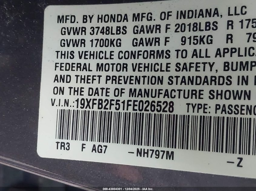 2015 HONDA CIVIC 2015 року Бензин, 1.8, Передній привід, vin - 19XFB2F51FE026528 з США