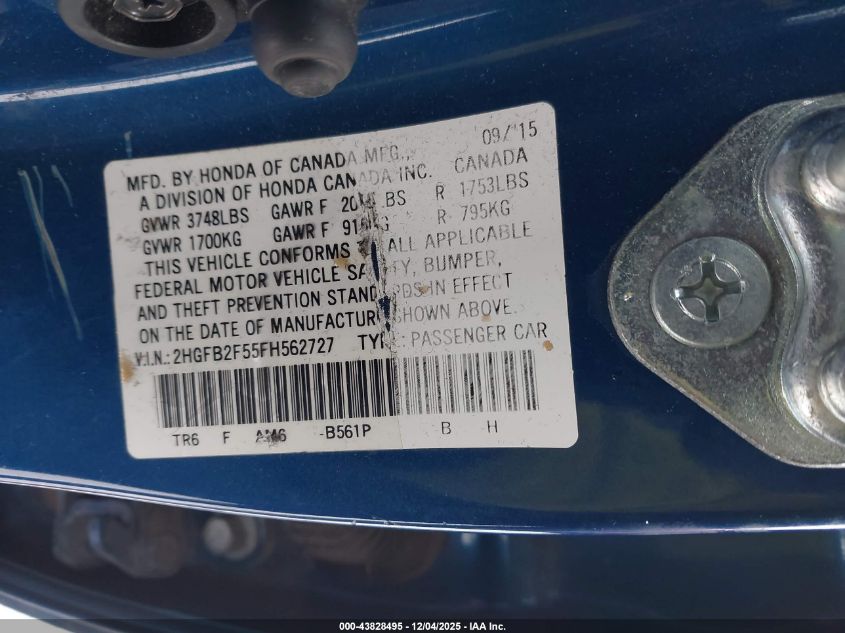 2015 HONDA CIVIC 2015 року Бензин, 1.8, Передній привід, vin - 2HGFB2F55FH562727 з США