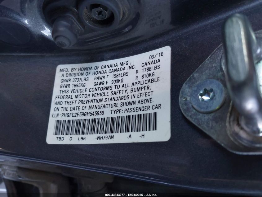 2016 HONDA CIVIC 2016 року Бензин, 2.0, Передній привід, vin - 2HGFC2F59GH545959 з США