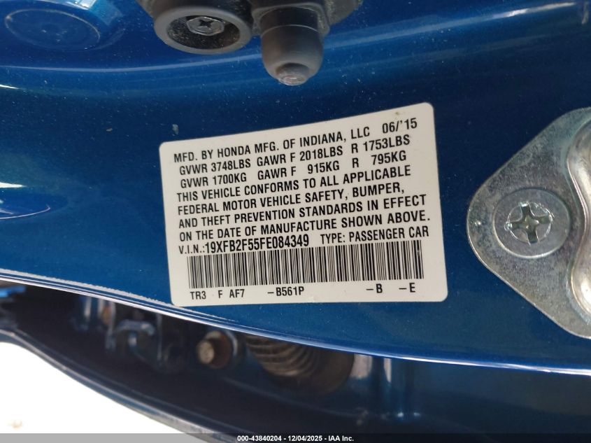 2015 HONDA CIVIC 2015 року Бензин, 1.8, Передній привід, vin - 19XFB2F55FE084349 з США