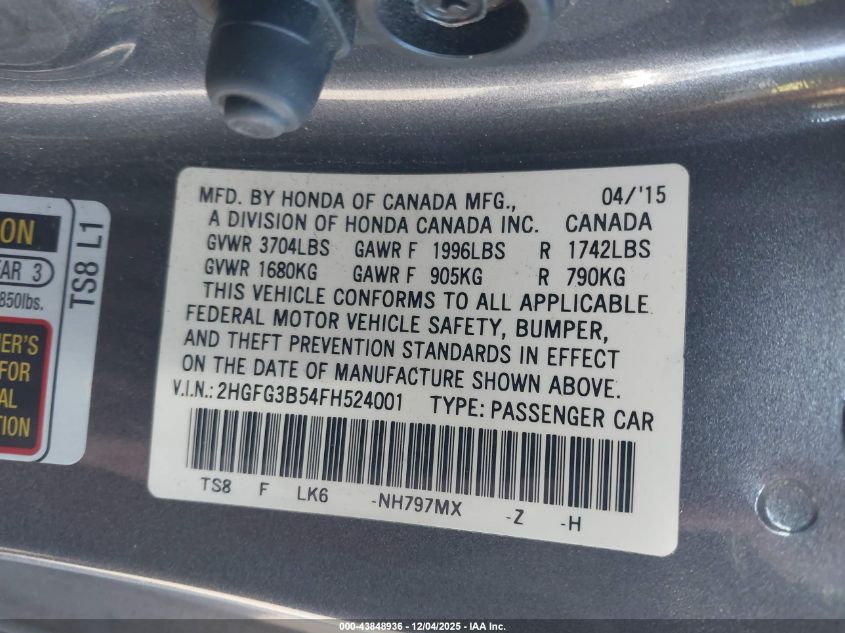 Колір СірийЦиліндри 4Привід Передній привідVIN 2HGFG3B54FH524001Стан СтаціонарноУшкодження Передня або задня AutoRIA