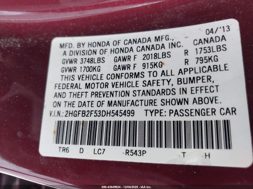 2013 HONDA CIVIC 2013 року Бензин, 1.8, Передній привід, vin - 2HGFB2F53DH545499 з США