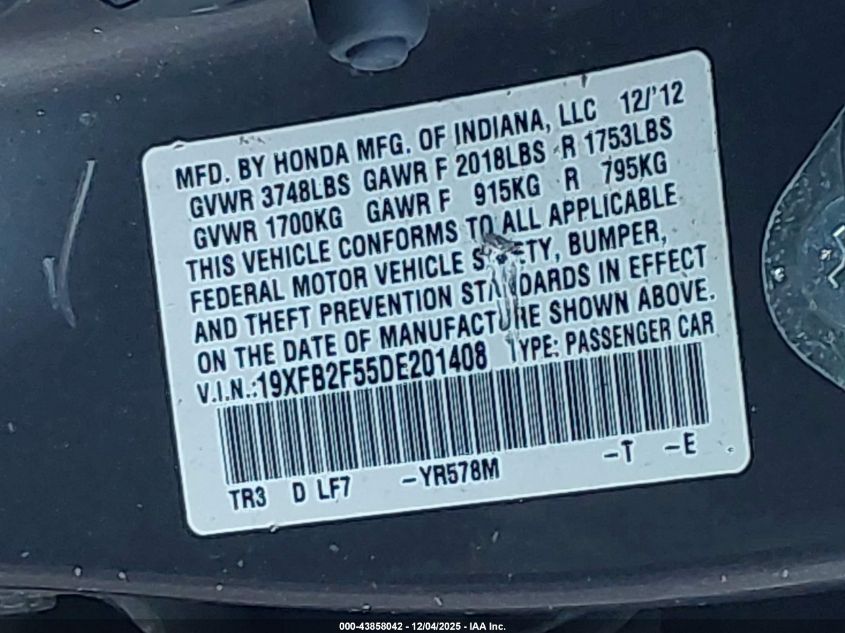 2013 HONDA CIVIC 2013 року Бензин, 1.8, Передній привід, vin - 19XFB2F55DE201408 з США