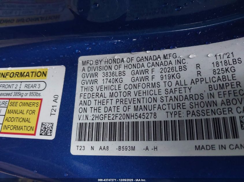 2022 HONDA CIVIC 2022 року Бензин, 2.0, Передній привід, vin - 2HGFE2F20NH545278 з США