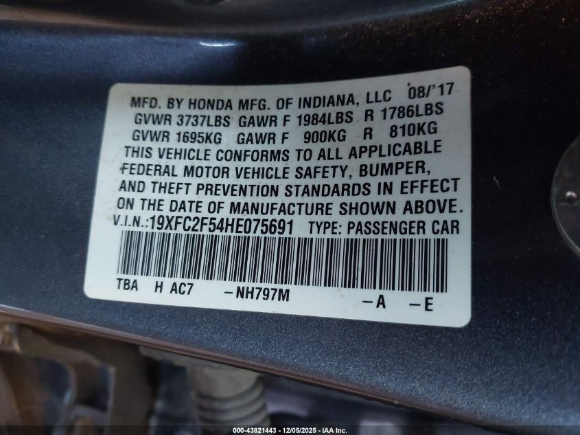 2017 HONDA CIVIC 2017 року Бензин, 2.0, Передній привід, vin - 19XFC2F54HE075691 з США