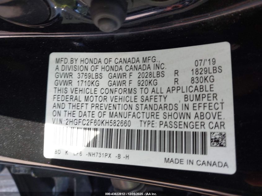 2019 HONDA CIVIC 2019 року Бензин, 2.0, Передній привід, vin - 2HGFC2F60KH582660 з США