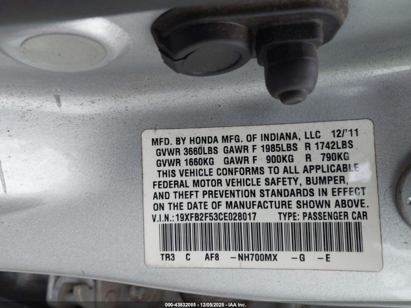 2012 HONDA CIVIC 2012 року Бензин, 1.8, Передній привід, vin - 19XFB2F53CE028017 з США